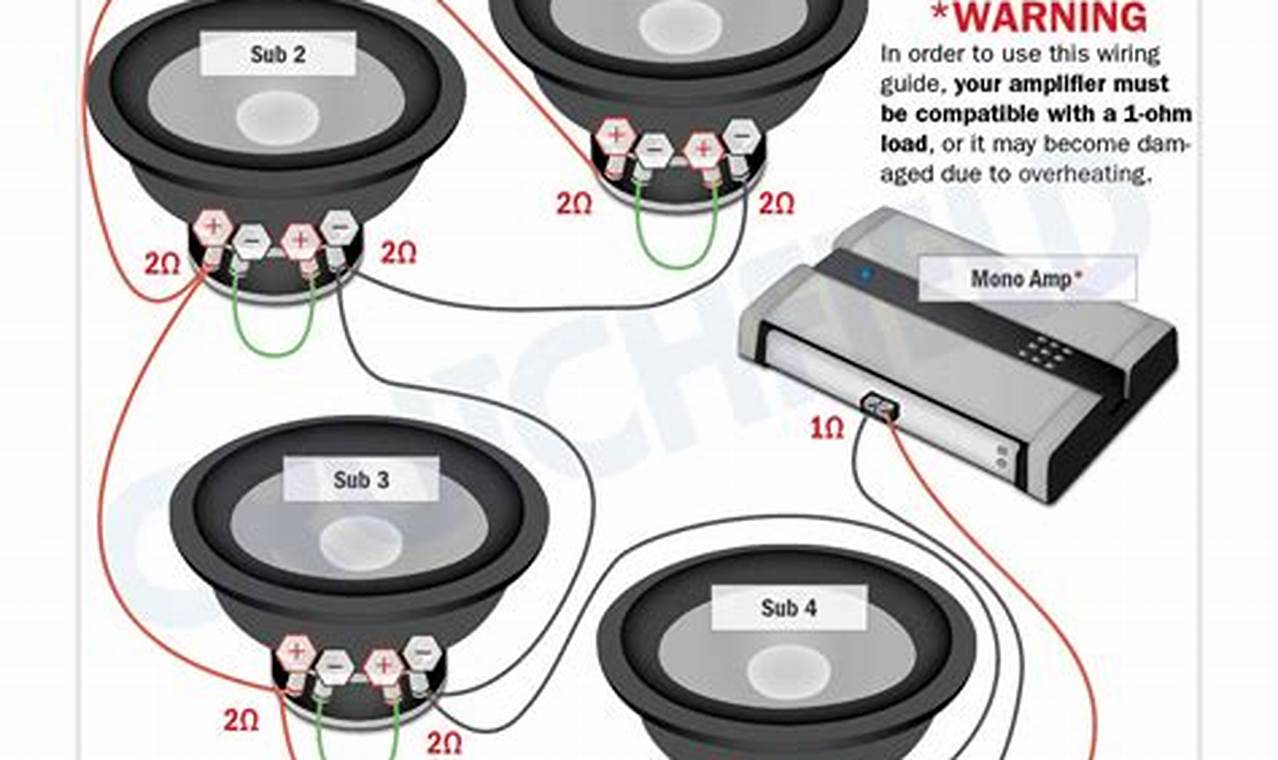 Understanding a 4 subwoofer wiring diagram is crucial for anyone looking to enhance their car audio system or home theater setup with multiple subwoofers. The diagram provides a visual representation of how to connect your subwoofers to your amplifier, ensuring optimal performance and preventing potential damage to your equipment. Without a proper wiring diagram, you risk improper impedance matching, which can lead to a weak sound output, overheating, and even amplifier failure. Essentially, the 4 subwoofer wiring diagram serves as a roadmap for achieving the desired sound quality and longevity of your audio components.