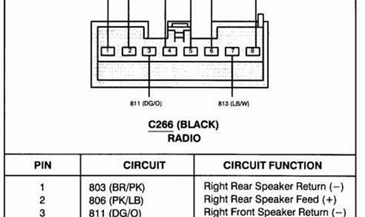 An electrical schematic typically presents a simplified visual representation of an electrical circuit. It utilizes standardized symbols to denote various components, such as wires, connectors, fuses, and the radio unit itself. Wires are often represented as lines, with different colors indicating specific functions (e.g., power, ground, speaker outputs). Connectors are shown as interlocking shapes, indicating where wires connect to other components. Fuses, which protect the circuit from overloads, are depicted with a distinctive symbol, and the radio is displayed as a box with input and output terminals. Color-coding and clear labeling are essential elements that provide critical information about each wire’s purpose and destination.